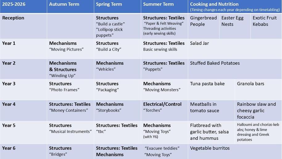 From Year 1, cookery is taught in small groups by one of our TAs who was a Home Economist. As well as the cooking and nutrition skills listed below, the children develop: their reading skills through reading and following recipes; their measurement skills through measuring ingredients and their collaborative working skills through working as a team to produce their dishes.